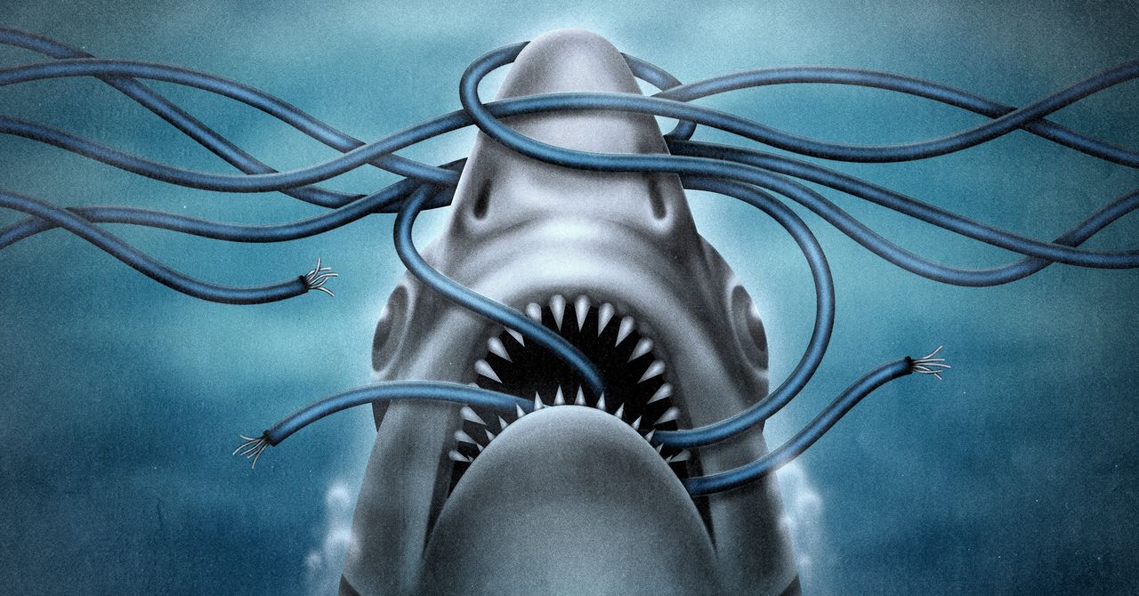Sharks are innocent. Or at least they’re not eating the internet. As a family of cartilaginous fish, sharks are collectively not guilty of most, if not all, charges of biting, chomping, chewing, or otherwise attacking the underwater network of fiber-optic cables. The people who build and maintain the nearly 600 subsea cables that carry almost all of our intercontinental traffic—supporting just about every swipe, tap, Zoom, and doomscroll anywhere on the planet—have a love-hate relationship with this myth, which has persisted for decades. They might even hate that I’m starting this piece with it.